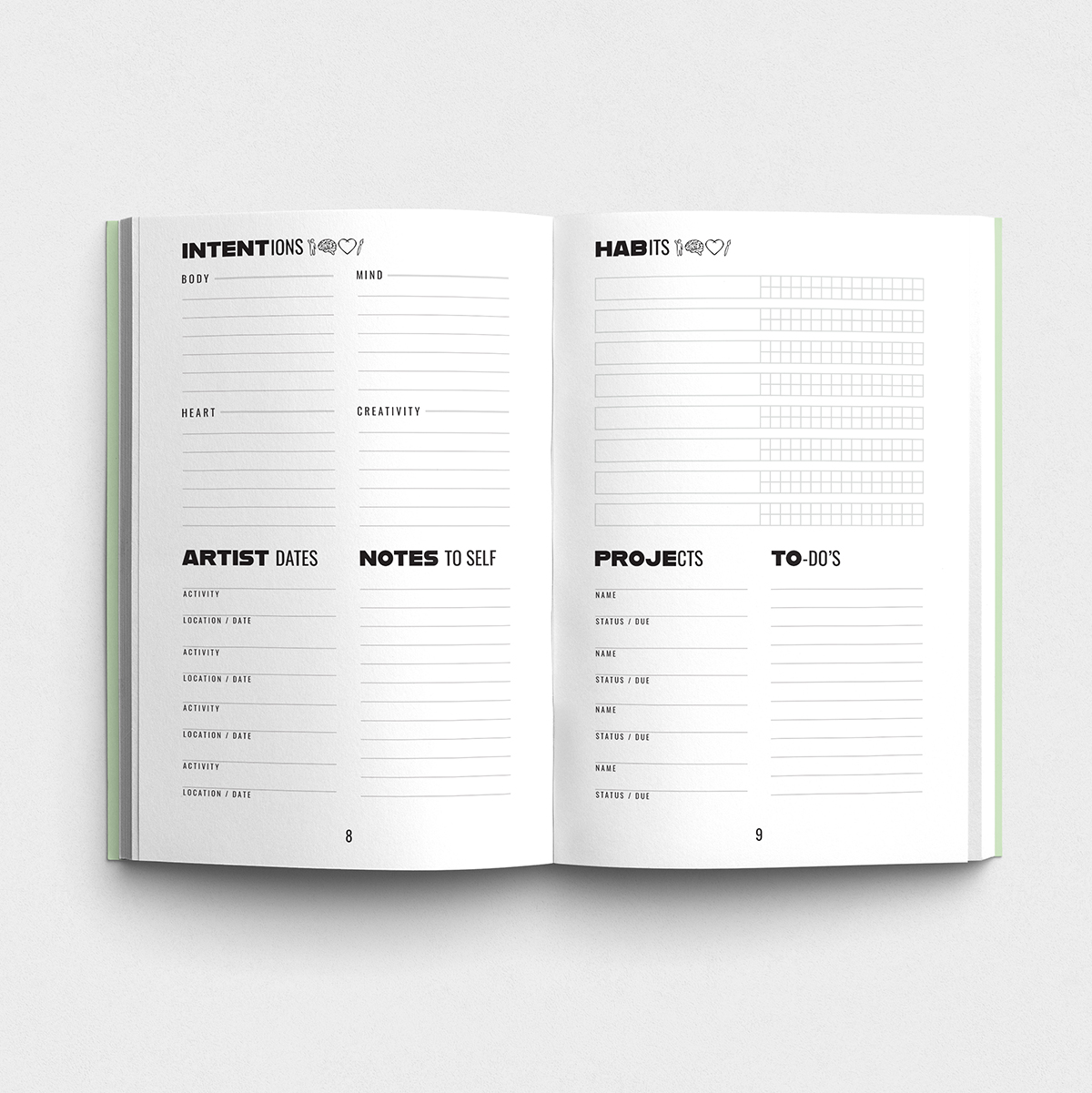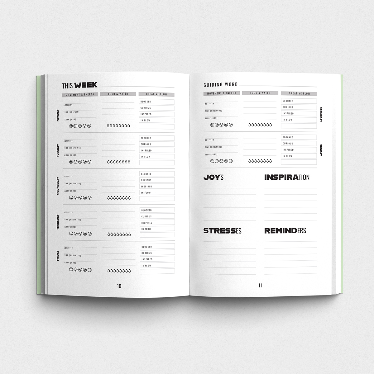 Body of Work is a wellness tracker created specifically for creative professionals. Built around the belief that creativity is rooted in the whole body (not just the mind), the book helps readers notice how movement, food, and emotional patterns influence their creative output over time.